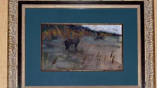 Василий Владимиров «Кентавры», превосходный рисунок эпохи русского модерна в живописи и серебряного века в поэзии, иллюстрация стихотворения Николая Гумилева, вернее его перевода «Побега Кентавров» Жозе де Эридиа, вышедшего в сборнике Гумилева «Трофеи» и в сборниках его переводов французской поэзии 1912-1920 годов. Бумага, акварель, двойное паспарту с золотым фигурным кантом, багет, размер вместе с рамой 37х48 см. Владимиров Василий Васильевич...