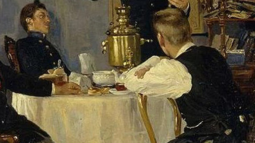 Тему небольшой подборки «чайных» картин навеяло название картины художника и литографа Ивана Абрамовича Клюквина (1818-1868) – «У товарища за самоваром (в Петергофе)», написанной в 1837 году. Уроженец Торопца, сын крепостного, Клюквин в 1834 году стал вольноопределяющимся учеником Санкт-Петербургской Академии художеств и подопечным Общества поощрения художеств, а в 1840 году получил звание неклассного художника. В его картине «У товарища за самоваром (в Петергофе)» интересно все: и интерьер, и пейзаж, и костюмы, и конечно же, сервировка чайного стола пушкинской эпохи...