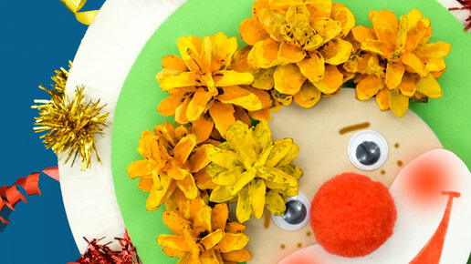 Не секрет, что все дети любят пошуметь и их радуют звучащие игрушки. Сегодня сделаем весёлую шумелку для детского праздника. Объёмную аппликацию с клоуном также можно использовать для украшения открытки. Шумелка своими руками Для работы нам понадобятся: Первое, что мы сделаем это возьмём сосновые шишки и покрасим их в какой-нибудь яркий цвет. Мой клоун будет рыжим. Пока шишки сохнуть задекорируем тарелки и сделаем шумелку. Смотрите 4 фотографии. Нанесём клей по окружности первой тарелки и закроем второй...