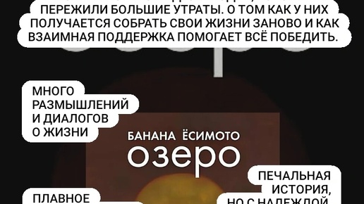 Прочитала книгу "Озеро". Конечно, японская проза отличается от европейской. Это такое медленное и плавное повествование, множество размышлений. И это просто кусочек из жизни двух людей. Каждый из них пережил утрату и теперь пытается с ней справиться...
