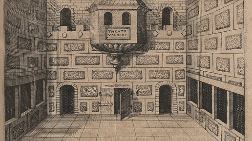У Роберта Фладда есть довольно известная гравюра, изображающая сцену театра, которую он предлагает использовать в качестве "дворца памяти". Исследовательница Фрэнсис Йейтс в книге "Театр мира" полагает, что это чуть ли не единственное и уникальное изображение сцены легендарного общественного театра "Глобус", для которого Шекспир писал свои пьесы и о котором почти не сохранилось свидетельств, как он мог выглядеть (свидетельства чуть ли не по сусекам скребли, хотя шекспироведы меня, может, тут и поправят)...