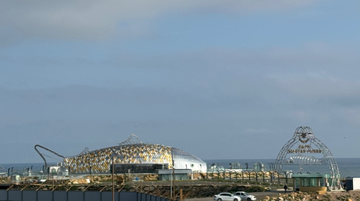 С балкона нашего номера открывался шикарный вид на пляж и косу, на которой расположен парк «Золотая рыбка» с удивительным рестораном в виде рыбы...