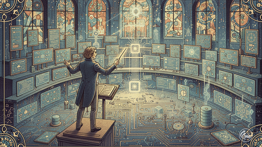 В просторном зале с высокими сводами расположились участники необычного оркестра. Перед пультом управления замер новый дирижёр, глаза которого изучали удивительное собрание исполнителей. Здесь были и классические скрипки-аналитики, выводящие строгие математические формулы, и мощные трубачи-процессоры, обрабатывающие потоки данных, и хор тонких голосов нейросетей, способных имитировать любые эмоции. Каждый музыкант представлял собой уникальную программу со своими алгоритмами и протоколами. Одни предпочитали логические последовательности, другие — хаотичные квантовые прыжки мышления...