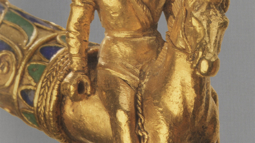 Сокровища Золотой кладовой гривна с фигурками всадников-скифов на концах. (Деталь). Золото, эмаль. 24 х 25,5 см. IV в. До н. Э., области соседства греков и “варваров” в Северном Причерноморье, Боспорское царство...