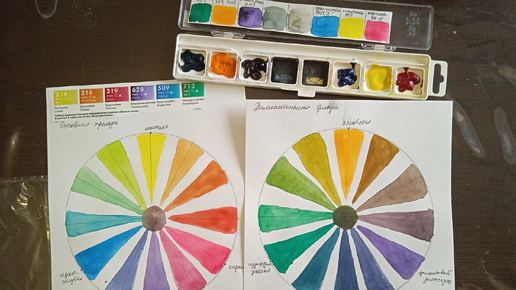 Колористика- это наука о цвете. О том, как цвета взаимодействуют друг с другом, как правильно их применять , для достижения определённых целей. В колористике цвета делят на первичные, или основные (красный, жёлтый, синий), вторичные ― те, что получаются при смешивании первичных (оранжевый, зелёный, фиолетовый), и третичные ― они получаются, если соединить цвета из первых двух групп. Есть очень полезная схема наглядной демонстрации смешиваний - круг Иттена. Вот он: Для тренировки "цветомера" глаза полезно посмешивать разнообразные оттенки из 3 цветов...