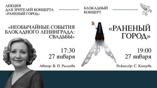 27 января ко Дню полного освобождения Ленинграда от фашистской блокады в Театре «На Литейном» пройдут памятные мероприятия: Лекция Валерии Рылеевой и спектакль-концерт в постановке Светланы Князевой 17:30 – ЛЕКЦИЯ «НЕОБЫЧАЙНЫЕ СОБЫТИЯ БЛОКАДНОГО ЛЕНИНГРАДА: СВАДЬБЫ». ЛЕКТОР – ВАЛЕРИЯ РЫЛЕЕВА Жизни колесо не останавливалось в осажденном городе: перед лицом возможной гибели под бомбежкой или от голода и холода, люди, как в мирное время, встречались, влюблялись, а влюбленные играли свадьбы, бросая вызов войне и самой судьбе...