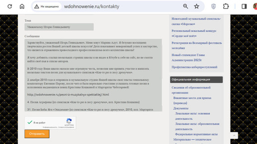 2 Фев 2024 - 13:48 Сегодня написала письмо уважаемому Помазкину Игорю Геннадьевичу: Здравствуйте, уважаемый Игорь Геннадьевич. Меня зовут Марина Адут. Я безумно восхищена творческим ростом Вашей детской школы искусств! Дети показывают невероятный успех и мастерство, что является отражением превосходного профессионализма всего коллектива школы! Я хочу добавить ссылки нескольких страниц школы и на видео в Ютубе к себе на сайт, но не смогла найти своё имя в списке авторов. В 2010 году Ваша школа оказала...