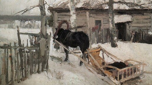 Образ среднерусской зимы более задушевен, лиричен. В нем вполне очевидно Коровин вспоминал пейзажи своего первого учителя Саврасова. Приветлива интимная композиция Зимы, где все сосредоточено на переднем плане, замкнутом от остального пространства избой, а слева изгородью. Темное пятно деревенской лошадки, впряженной в сани, поставлено по зрительному центру. Здесь все так и пронизано уютом, обжитостью, настроением спокойно текущей человеческой жизни. Серебристо-серая гамма в этом произведении значительно светлее, чем в северных работах...
