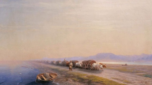 , (1817–1900). "Волы на перешейке", 1860 Холст, масло, 58х88 см Из фондов: Рыбинский государственный историко-архитектурный и художественный музей-заповедник. Творчество Айвазовского не ограничивалось одним стилем, что свойственно всем выдающимся мастерам. Его творческое наследие насчитывает около шести тысяч пейзажей. При жизни он организовал более 120 выставок как в России, так и за рубежом. На картине «Волы на перешейке» животные идут неторопливо, а море остаётся спокойным. Создаётся впечатление, что их движение вдоль бескрайней морской линии будет длиться вечно...