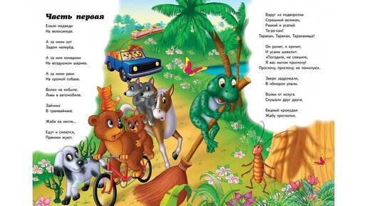 Часть первая . Ехали медведи На велосипеде. . А за ними кот Задом наперёд. . А за ним комарики На воздушном шарике. . А за ними раки На хромой собаке. . Волки на кобыле. Львы в автомобиле. . Зайчики В трамвайчике. . Жаба на метле… Едут и смеются, Пряники жуют. . Вдруг из подворотни Страшный великан, Рыжий и усатый Та-ра-кан! Таракан, Таракан, Тараканище! Он рычит, и кричит, И усами шевелит: «Погодите, не спешите, Я вас мигом проглочу! Проглочу, проглочу, не помилую». . Звери задрожали, В обморок упали...