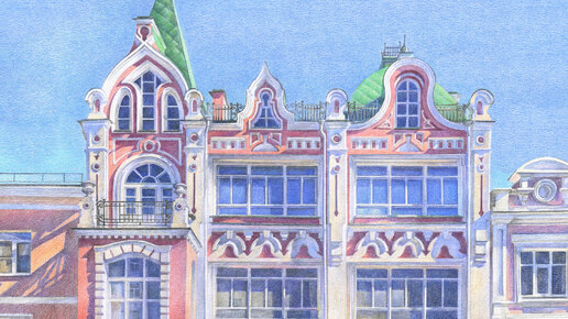Любите ли вы архитектуру так, как я люблю её..? Бывает, прогуливаешься мимо компактного трёхэтажного здания, обладающим ассиметричным живописным силуэтом в стиле модерн, и восхищаешься килевидным щипцом с трёхчастным чердачным окном. Залюбуешься и приподнимешь силой мысли завесу строительной сетки, а там: широкое окно эркера с криволинейной перемычкой, рустованный наличник, балкон с лепными вазонами на угловых тумбах. И вот уже взгляд скользит по двум группам стилизованных кокошников, по изгибам фигурного фронтона, изящному рисунку решётки балкона...