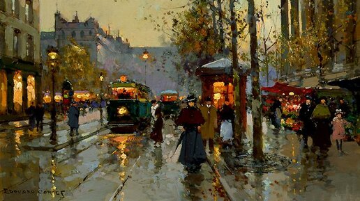 Эдуард Леон Кортес (1882-1969) - французский художник-импрессионист. Родился в Лани (Нормандия) в семье художника, выходца из Испании. Впервые работы Кортеса были представлены в 1899 году на Парижском салоне. Ему было только всего 16 лет, но публика и критики тепло приняли произведения юного дарования. С этого момента успех всегда сопутствовал творческой судьбе Кортеса, писавшего красочные виды Парижа. Он любил изображать огни ночного города, мокрые от дождя или снега улицы, кареты, автомобили, трамваи, нарядных парижан, спешащих под вечер в театр или кабаре...