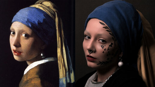 Сделала пародию на картину «Девушка с жемчужной серёжкой». Теперь у неё тату и пирсинг