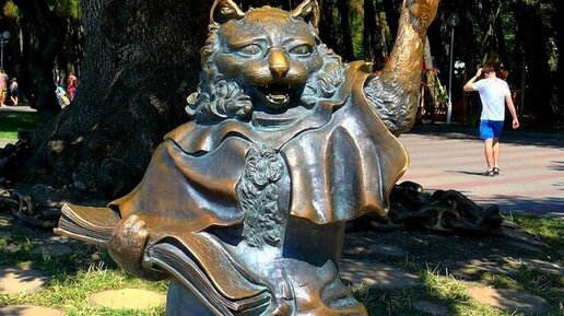 😺СКУЛЬПТУРА КОТ УЧЕНЫЙ😺 Скульптура «Кот ученый» в Геленджике Одним из необычных и интересных памятников в Геленджике является – скульптура «Кот ученый». В статье «Скульптура “Кот ученый” в Геленджике» рассмотрим описание, год установки и месторасположение памятника. Памятник «Кот ученый» в Геленджике описание Выполнена скульптура из бронзы и представляет собой цельную единую композицию. Помимо кота, который стоит на первом плане, дальше можно увидеть золотую цепь, обмотанную вокруг дуба, а наверху на ветвях сидит красивая русалка, свесив свой зеленый хвост...