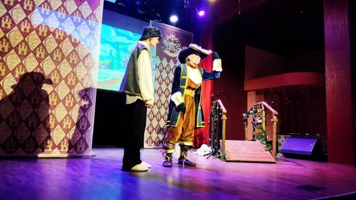 "Думать надо головой, а не пузом". Посмеяться, почувствовать себя рыбкой на крючке и немого "подумать головой"... как ни странно, но это о спектакле "Кот в сапогах". Сюжет классический: как кот своего хозяина на принцессе женил. Преподносится с юмором. Во время представления актеры взаимодействуют со зрителями. Интегрируют в сюжет игру светом и пространство вне сцены. Ходили с ребенком 3,5 лет. Несмотря на то, что ребенку представление понравилось, считаю, что для него рановато. Возрастная категория стоит 0+...
