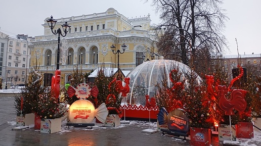 Взглянув на восхитительные шоколадные лакомства и многочисленных поделочных лошадок на «Новогодней Горьковской ярмарке», я плавно переместилась к следующей новогодней локации Нижнего Новгорода – Театральной площади, которую в 2026 году оформили в стиле… отсылки к популярной в конце XIX - начале XX века «Горьковской Ёлке» - благотворительного мероприятия, призванного устроить праздник для детей из бедных семей. В наши дни традиции «Горьковской Ёлки» переняты муниципальными учреждениями культуры Нижнего Новгорода...