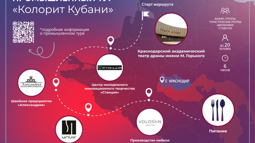 О запуске сообщили в пресс-службе администрации региона. Сейчас в крае действует шесть индустриальных маршрутов, организованных предприятиями промышленности, пищепрома и винного кластера. Как рассказал министр промышленной политики края Дмитрий Хмелько, маршрут создали участники пятой программы «Открытая промышленность» совместно с Фондом развития промышленности и профильными ведомствами. Шестичасовая экскурсия включает посещение швейной фабрики «Александрия», мануфактуры «SI MOSAIC», мебельного производства «Voloshin Factory», а также Краснодарского академического театра драмы им...