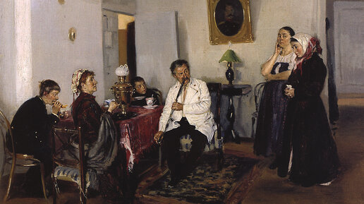 На этой картине мы видим семью во время утреннего чаепития. Муж, жена и двое детей сидят за столом у самовара, вот только взгляды их обращены совсем не на завтрак, а на вошедшую в комнату гостью.