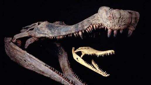 На фото - сравнение черепов саркозуха и нильского крокодила. Нильский крокодил (маленький белый череп) – самый крупный крокодил в Африке. В мире из современных немного уступает лишь гребнистому. Нильский крокодил – вершина пищевой цепочки в местах своего обитания. Вырастает в длину до пяти метров. Только представьте, нильский крокодил ест бегемотов, носорогов, жирафов и львов! Натуралисты зафиксировали один случай страшной бойни в Танзании, когда 4-метровый крокодил затащил в воду самку черного носорога весом 2 тонны...