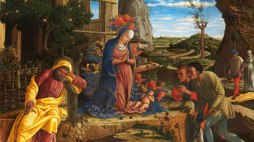 «Поклонение пастухов», предположительно, было завершено, когда Андреа Мантенья (ок. 1431-1506) работал над фресками из жития Святого Иакова. Это небольшая (37,8 x 53,3 см) картина, вероятно, была заказана Борсо д’Эсте во время пребывания художника в Ферраре в 1450 году. На ней изображено открытое пространство, в центре которого расположена Мадонна, преклоняющая колени перед Младенцем Христом на каменной ступеньке. Справа от неё Иосиф спит после утомительного путешествия, а слева — два пастуха склонились в молитве...