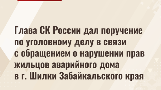Глава СК России дал поручение по уголовному делу в связи с обращением о нарушении прав жильцов аварийного дома в г. Шилки