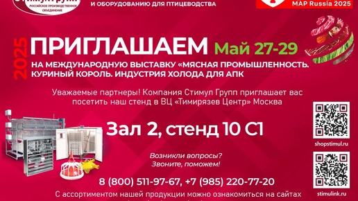 Очень скоро состоится Международная выставка Куриный Король 2025! Приглашаем вас на наш стенд 10С1 в ВЦ «Тимирязев Центр» Москва, зал 2 (Вавилов). На нашем стенде вы сможете ознакомиться с передовыми технологиями в таких направлениях, как инкубация, клеточное содержание с-х птицы, напольное содержание при разведении...