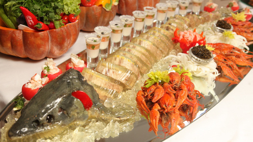 ...Жареная, паровая, соленая, копченая, вяленая рыба входила в ежедневное меню. Особо ценились блюда из севрюги, осетрины, лососины, кеты, белужины, стерляди. Примечательна история, рассказанная А. Я. Булгаковым в письме к брату: «Намедни славный Строганов давал обед Александру Львовичу (недавно приехал и на днях едет); вдруг пожар в доме, прискакала полиция, все встревожились. Ал. Львович ne perdit pas la tete et se mit a crier* [* Не растерялся и принялся кричать (фр.)]: спасайте стерлядей и белужину!»...