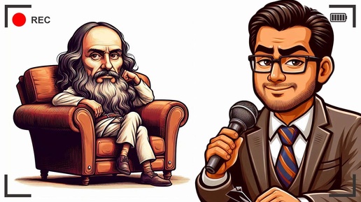 (В минималистично оформленной студии. На стенах — проекции произведений искусства от эпохи Возрождения до современности. За столом сидит журналист с выражением профессионального скептицизма.) Сергей Недоверов: Добрый день, дорогие зрители канала "Невозможный диалог"! Согласно формуле нашей передачи, сегодня у нас в гостях человек, который никоим образом не мог оказаться в нашей студии. (поправляет очки) Передо мной якобы сидит Леонардо да Винчи — художник, изобретатель, ученый и один из величайших умов эпохи Возрождения...
