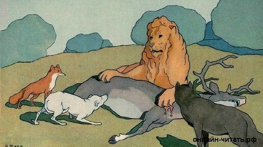 И. А. Крылов Собака, Лев, да Волк с Лисой В соседстве как-то жили, И вот какой Между собой Они завет все положили: Чтоб им зверей съобща ловить, И что́ наловится, всё поровну делить. Не знаю, как и чем, а знаю, что сначала Лиса оленя поимала, И шлет к товарищам послов, Чтоб шли делить счастливый лов: Добыча, право, недурная! Пришли, пришел и Лев; он, когти разминая И озираючи товарищей кругом, Дележ располагает И говорит: «Мы, братцы, вчетвером». И на четверо он оленя раздирает. «Теперь, давай...