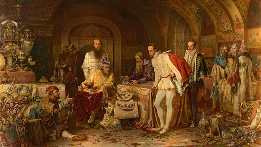 Эту картину, созданную в 1875 году, можно читать, как книгу. Здесь есть и реальные исторические персонажи – русский царь и английский дипломат, и настоящие сокровища, которые можно увидеть и сегодня. АННА ПОПОВА Сюжет понятен уже из названия: «Иван Грозный показывает сокровища английскому послу Горсею». Художник изобразил царя, сидящего в Оружейной палате. В руках он держит шкатулку с жемчужным ожерельем и серьгами. Еще одну торопливо открывает придворный. Ивана IV внимательно слушает дипломата в белом дублете – это Джером Горсей...