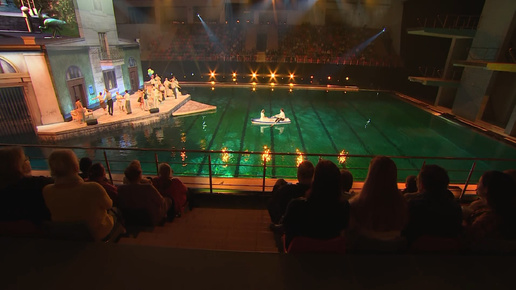 На земле, в воде и воздухе — о силе духа и умении ждать. Российская премьера в Петербурге. Театр под руководством Марии Киселевой представил петербургской публике уникальный спектакль — «Люблю и верю». Постановку посвятили юбилею Великой Победы. Акробаты, синхронисты, танцоры, певцы создали невероятно красивый и эмоциональный рассказ про влюбленных, разлучённых войной. Вот их встреча. А это уже сцена боя и гибели солдат. Блокада. Госпиталь. Обстрелы. Всё это передано языком музыки и света. Фронтовые письма стали надеждой и опорой...