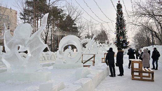 В конкурсе приняли участие 9 команд. В каждой по два человека. Из 9 ледяных блоков они сотворили произведения искусства в Новогодней тематике. Каждая скульптура связана с музыкой.«Для мастеров был специально доставлен лёд из озера. Это принципиально. Очень давно, лет 20 назад, мы поднимали лёд с Амура – он с песком. Из-за этого стамески у скульпторов очень быстро приходят в негодность. В этом году лёд хороший, поэтому и фигуры получились на загляденье», - прокомментировал Сергей Логинов, заслуженный художник Хабаровского края, почётный гражданин города Хабаровска...