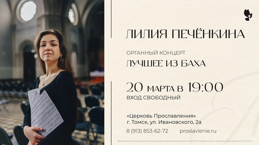 🎹 20 марта (пятница) в 19:00 приглашаем вас на вечер органной музыки, где в преддверии дня рождения И.С. Баха прозвучат его лучшие композиции. За органом — Лилия Печёнкина — лауреат международных конкурсов (им. Таривердиева, им. Браудо, Всероссийского музыкального конкурса), выпускница аспирантуры Высшей школы музыки в Лейпциге (класс профессора Мартина Шмединга)...