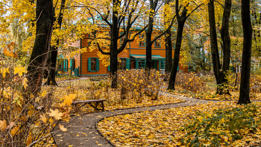 Перед вами замечательный сад усадьбы Льва Толстого в Хамовниках. Осенью он особенно прекрасен! Сад и деревянный дом сохранился с того времени, как здесь жил писатель с семьей. Лев Николаевич купил усадьбу в 1882 году и прожил здесь 19 зим. Дом с огромным садом в 1 гектар, засаженным малиной, крыжовником и яблонями, напоминал Толстым их деревенский дом в Ясной поляне, куда они всегда уезжали на лето. В саду стоит беседка с колоннами – любимое место отдыха Толстых, также здесь есть насыпной холм с лавочкой на вершине – любимое место для размышлений писателя...