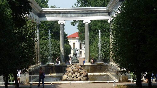 Эрмитажный каскад неподалёку от одноимённого павильона был построен в 1801 году по проекту архитектора Андрея Воронихина. Водопадные уступы были выполнены из пудостского камня и украшены бронзовыми сторожевыми львами. В 1854-1857 годах на месте разобранного из-за ветхости Эрмитажного каскада построили «Львиный» по проекту Андрея Штакеншнейдера. Старые львиные статуи установили по сторонам колоннады из мрамора и гранита. В центре бассейна появилась нимфа Аганиппа, которая считается покровительницей источника возле горы Геликон...