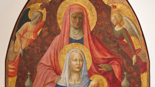 Эта панель, снова показывающая нам Деву Марию с Младенцем, на этот раз с матерью, сидящей позади неё, как полагают, была совместной работой Мазаччо (годы жизни 1401-1428) с художником по имени Мазолино да Паникале (годы жизни 1383-1447). По словам Джорджо Вазари (годы жизни 1511-1574), изначально она стояла в Церкви Сан-Амброджо во Флоренции (Италия) – прямо у входа в монастырские покои. Как кажется, это самое подходящее место для данной картины, сосредоточенной на Деве Марии и её матери Святой Анне, поскольку они издревле считались главными моделями идеальной христианской женщины...