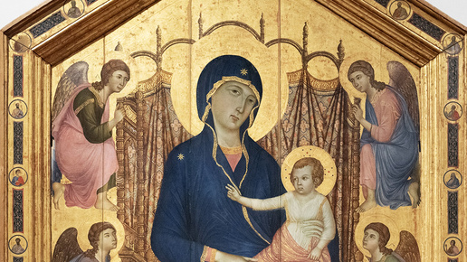 На картине «Мадонна Ручеллаи» итальянского художника Дуччо ди Буонинсенья (ок. 1255/60–1318/19) изображена Дева Мария, держащая на коленях Младенца, правая рука которого поднята в благословении. Она восседает на замысловатом деревянном троне, украшенном резьбой, а за её спиной висит риза из дорогой ткани. Трон поддерживают шесть коленопреклоненных ангелов. В обрамляющей картину раме находятся тридцать кругов с поясными фигурами апостолов и святых, в том числе святого Доминика, основателя доминиканского ордена, и святого Августина, чьему уставу следовали доминиканцы...