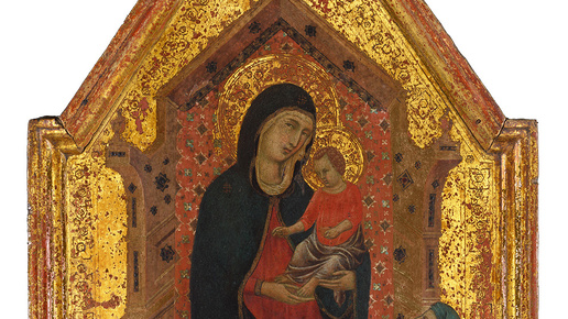 Под треугольным фронтоном, на троне из белого мрамора с инкрустацией в стиле cosmatesque, восседает Дева Мария с Младенцем Иисусом в руках. Она одета в синий плащ поверх красной туники и слегка повернута вправо. Младенец держит плод в левой руке, а правой благословляет юношу, стоящего на коленях у трона слева. Справа, с руками, сложенными в молитве, и поднятой головой, стоит на коленях мужчина-донатор в синем одеянии и cappuccio. Специалисты считают, что перед Богородицей на коленях стоят отец и сын...