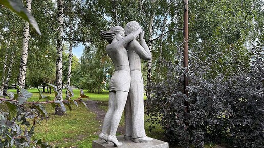 Свидание влюблённых у ГПНТБ Романтическая композиция в натуральную величину расположилась в сквере рядом с библиотекой. Она изображает влюблённую пару в момент встречи: юноша терпеливо ждёт свою спутницу под часами, которые, увы, не сохранились до наших дней, а девушка подходит сзади и закрывает ему ладонями глаза.