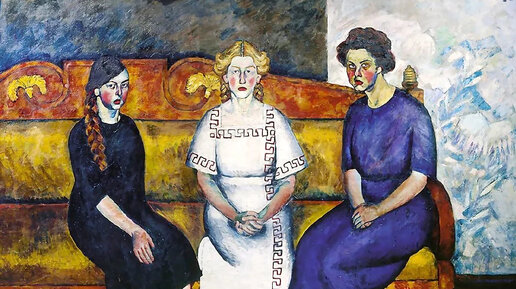 Продолжу описание своих впечатлений от посещения местного музея изобразительного искусства. Запомнилась своей необычностью еще одна картина – «Три сестры на диване. H., Л. и Е. Самойловы» художника Ильи Ивановича Машкова. Мои первые впечатления от этой картины: три девушки непонятного возраста, с зелеными руками и ярко нарумяненными щеками на синих лицах смотрят на меня своими недобрыми взглядами с высоты. Стало немного жутко от взглядов этих сестер и от их вида. «Что за дичь», – подумала я и пошла дальше рассматривать другие картины, более приятные для моих глаз...