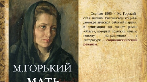 Роман Максима Горького "Мать", опубликованный в 1906–1907 годах, считается одним из первых произведений социалистического реализма. Он рассказывает о пробуждении революционного сознания в обычной женщине, матери, под влиянием сына и его товарищей. Действие происходит в рабочем поселке в начале XX века, на фоне социальных и политических перемен в Российской империи. Главные герои романа — Пелагея Ниловна и её сын Павел Власов. Пелагея — вдова, живущая в рабочем поселке, где царит нищета, пьянство и бесправие...
