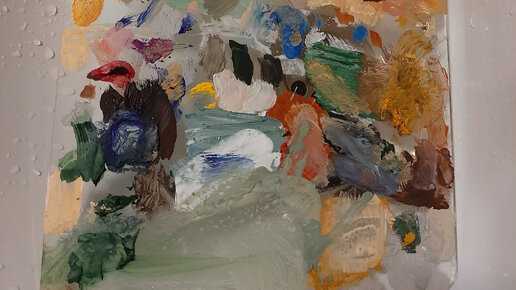 Палитра... Мне кажется, что это такая маленькая история картины! Что-то пригодилось само по себе, какие-то краски смешались. Вот эту дискотеку красок я обожаю! Как по мне, так надо к каждой картине выставлять палитру! Это же...