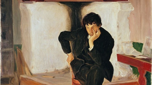 О картине. На картине изображён молодой человек, Торлеев Стадсклейв, погружённый в глубокие размышления. Его поза — сидящий, с руками, сложенными на коленях, — передает спокойствие и одновременно внутреннюю напряжённость. Лицо героя обращено вдаль, взгляд направлен в никуда, что подчёркивает его отрешенность от окружающего мира. Ярко-красные носки выделяются на общем нейтральном фоне, создавая акцент на внутреннем состоянии персонажа. Интерьер комнаты, в которой находится герой, выполнен в традиционном норвежском стиле...