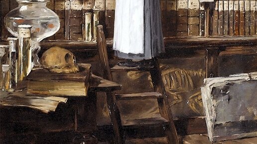 На этой картине изображен кабинет ученого, а точнее ученого-естествоиспытателя, биолога. Об этом говорит множество предметов интерьера: чучела птиц и летучих мышей, череп, скелет в шкафу и прочее. Так...