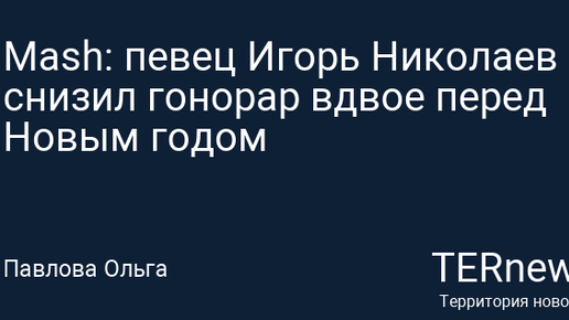 Политика Экономика и финансы Происшествия Спорт Культура и др. Наука и техника Медицина и здоровье Шоу-Бизнес Общество Авто В мире Певец Игорь Николаев оказался в непростой ситуации перед праздниками, утратив заявки на свои выступления. Как сообщает Telegram-канал Mash, артист был вынужден снизить свой гонорар с 10 миллионов до 5 миллионов рублей из-за недостатка корпоративов и концертов.