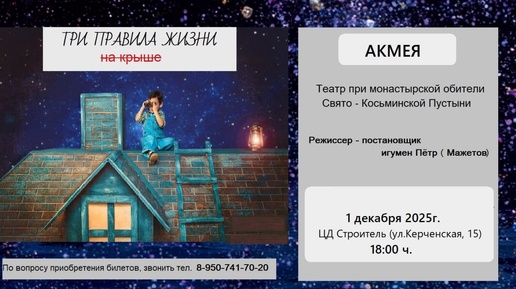 Приглашаем вас на уникальное театральное мероприятие! Впервые в Миассе театр «АКМЕЯ», руководитель и режиссер-постановщик — настоятеля Мужского монастыря Свято-Косьминской Пустыни (Верхотурье, д.Костылево). Это не просто спектакль, а путешествие в глубины души...