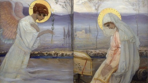 Дата создания: 1898 Техника: Масло, гуашь, золото Материал: Бумага на картоне Размер: 30×30 (каждая) В Библии: Лк. 1:26-38 Оригинал: Государственный художественно-архитектурный дворцово-парковый музей-заповедник «Павловск» Сюжет В основе сюжета – Благовещение – принятие Девой Марией вести о том, что Ей надлежит стать Матерью Самого Господа, воплотившегося Слова Божия. Благовещение означает «благая» или «добрая» весть, свидетельствующая о том, что отныне свершилось освобождение всего человеческого рода от греха и вечной смерти...