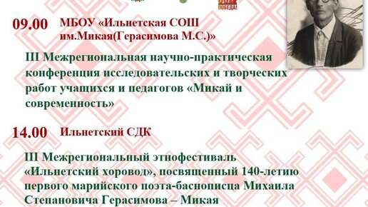 3 октября в селе Ильнеть состоятся мероприятия, посвящённые 140-летию первого марийского поэта-баснописца Михаила Степановича Герасимова, известного под псевдонимом Микай. Программа празднования: Место проведения: Ильнетская СОШ им. Микая (Герасимова М.С.) Место проведения:...