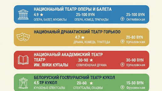 Минск — город с хорошей театральной культурой. Есть оперный театр (балет и опера), драматические театры (спектакли и комедии), кукольный театр (для детей). Я собрал информацию про 5 главных театров Минска: репертуар, артисты, билеты, рейтинги, отзывы, адреса, как забронировать. Это честный разбор на основе Культблагерт.by, 2ГИС и опыта зрителей. 📍 Адрес: пр. Независимости, 1 (м. Октябрьская, центр Минска)