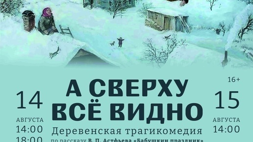 В рамках ІІ Форума «Опорные города России» на исторической сцене Минусинского драматического театра состоятся гастроли Красноярского драматического театра имени А.С.Пушкина. Будет представлена деревенская традикомедия «А СВЕРХУ ВСЕ ВИДНО» по рассказу В.П.Астафьева «Бабушкин праздник». Раздвинутся меха гармони, наберут воздух в свои музыкальные легкие, и задышит деревня светлой грустью доброй памяти. Было время, когда в праздники за одним столом собирались огромной дружной семьей родственники и друзья...